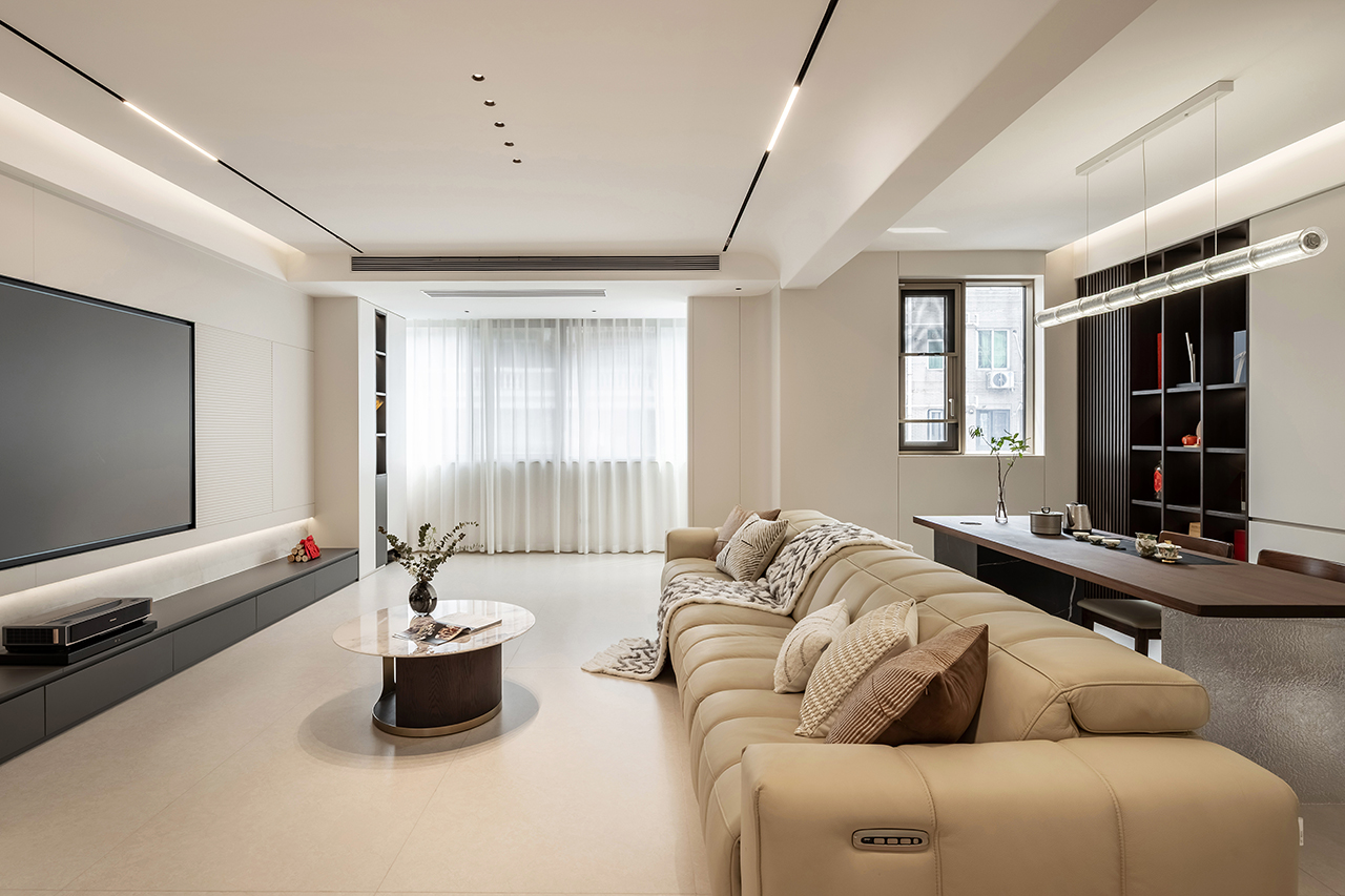 以浅暖象牙白为基底色调,搭配天然石材、金属与定制木饰面构建空间肌理。地面采用大板瓷砖通铺,墙面点缀淡灰色微水泥肌理,通过材质碰撞诠释现代轻奢美学。悬浮式石膏板吊顶搭配磁吸轨道灯系统,实现无主灯设计的层次光影。