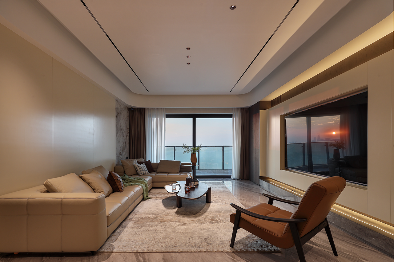 在宝能城顶层复式高空建筑中.俯瞰整个深圳美景.伸手可摘星辰.是一个充满梦想与温馨的家,为拥有三个小孩的幸福家庭打造了一个独具魅力的现代简约空间,一个充满星辰大海梦幻的空中家园。