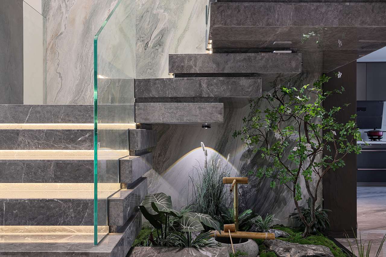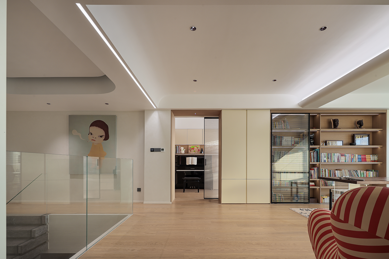 环绕式楼梯间被精心打造成一个小型的博物馆,展示着家庭的历史照片、旅行纪念品和珍贵的艺术品。玻璃展示柜和灯光的搭配,让每一件展品都显得格外珍贵。楼梯间的墙壁上也装饰着与星辰相关的艺术作品,使整个空间充满了艺术气息。