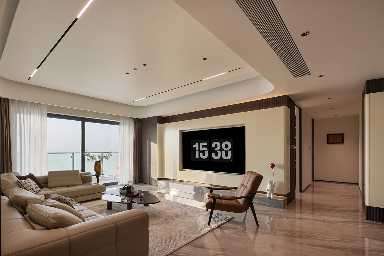 总面积达 380 平的顶层复式空间,合理地划分了功能区域。一楼主要是客餐厅,用于日常的会客与家庭聚会;二楼则规划为现代休闲空间和亲子学习空间,为家庭成员提供了舒适的休憩和成长环境。
