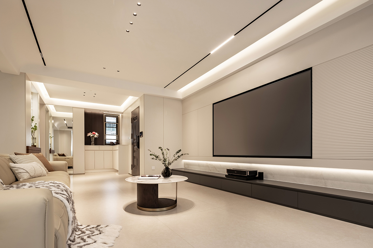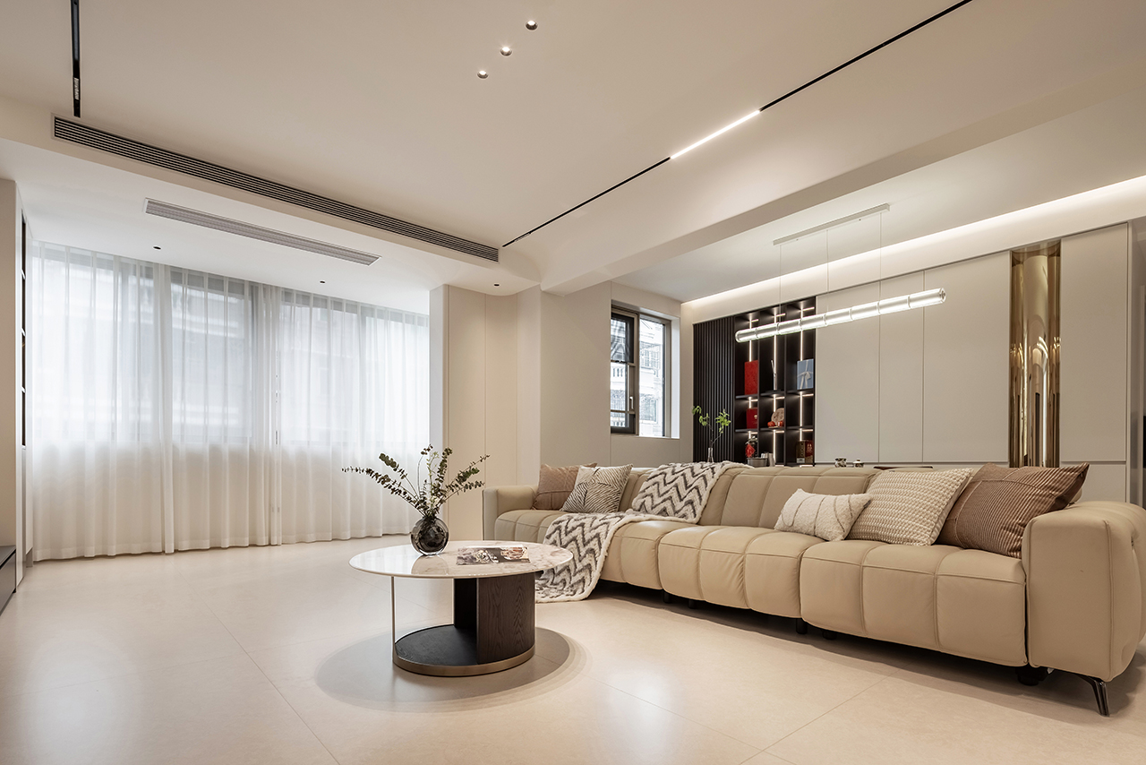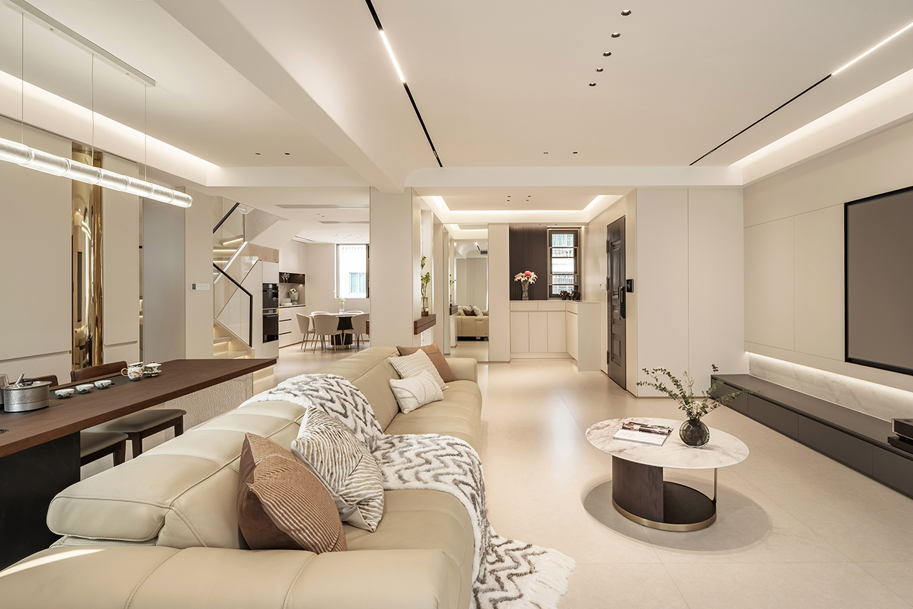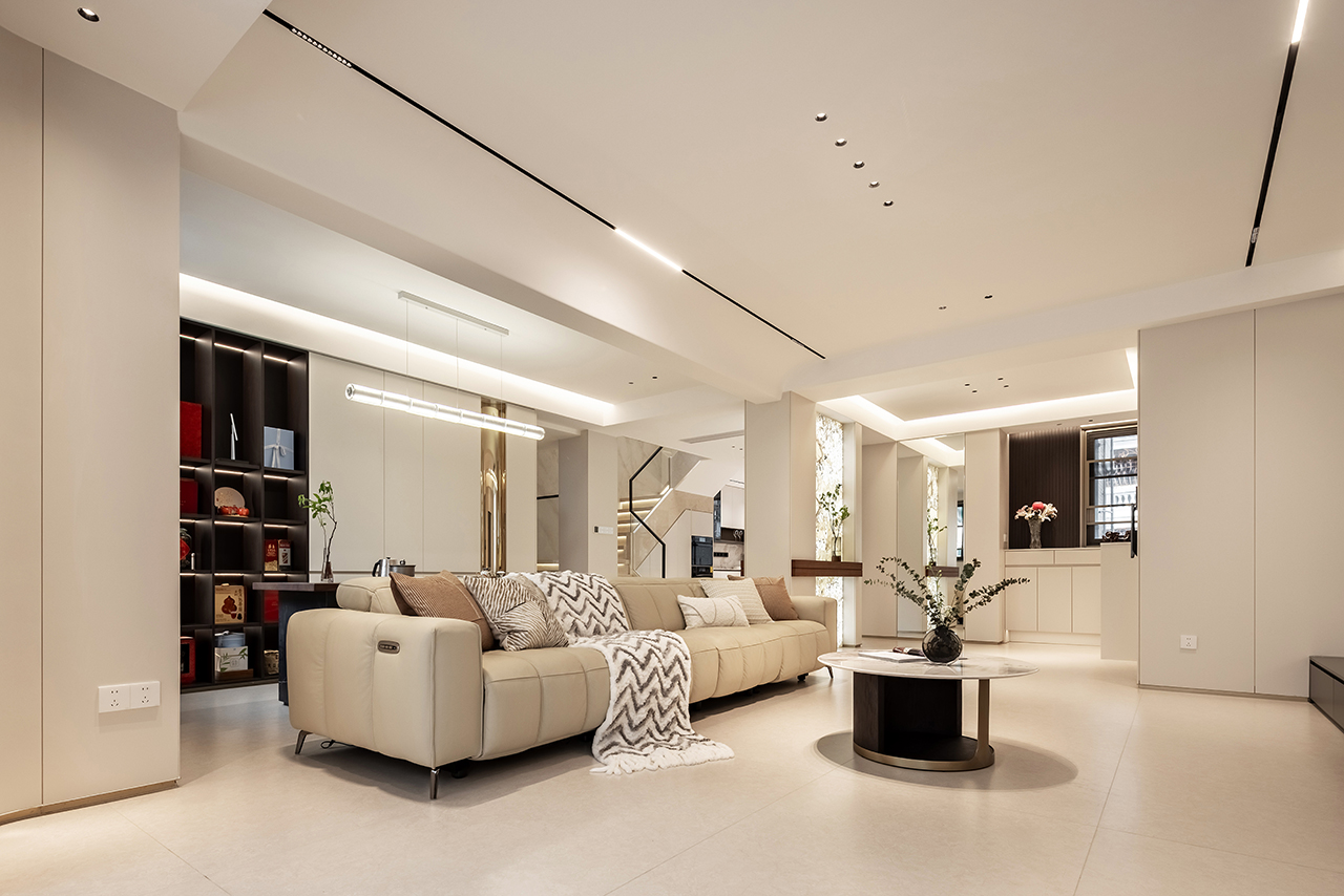 以浅暖象牙白为基底色调,搭配天然石材、金属与定制木饰面构建空间肌理。地面采用大板瓷砖通铺,墙面点缀淡灰色微水泥肌理,通过材质碰撞诠释现代轻奢美学。悬浮式石膏板吊顶搭配磁吸轨道灯系统,实现无主灯设计的层次光影。