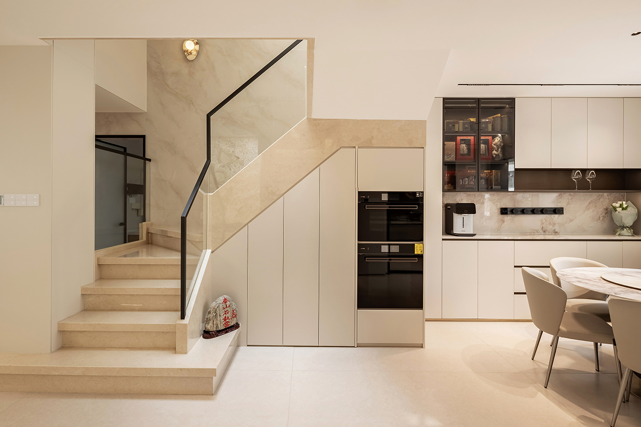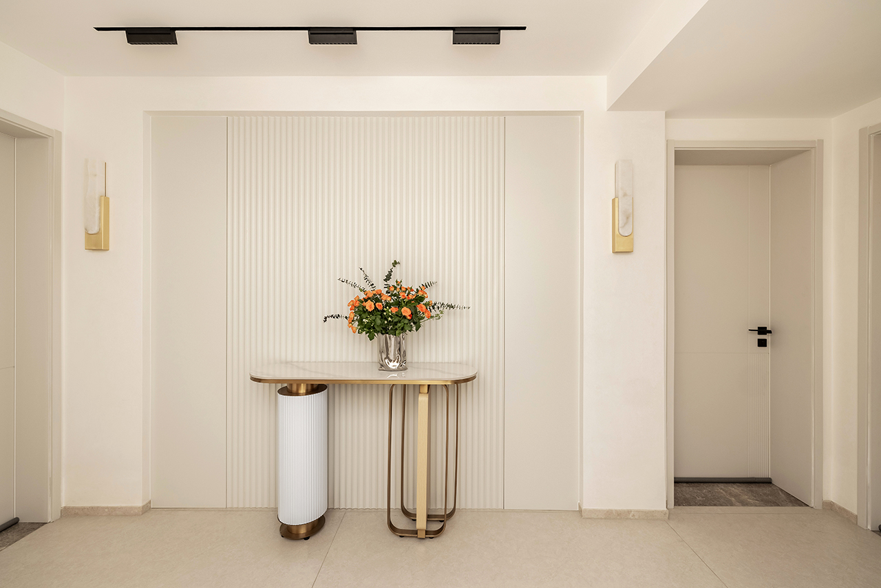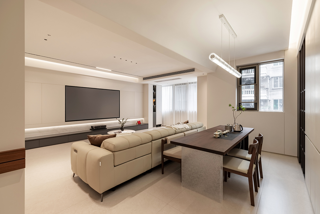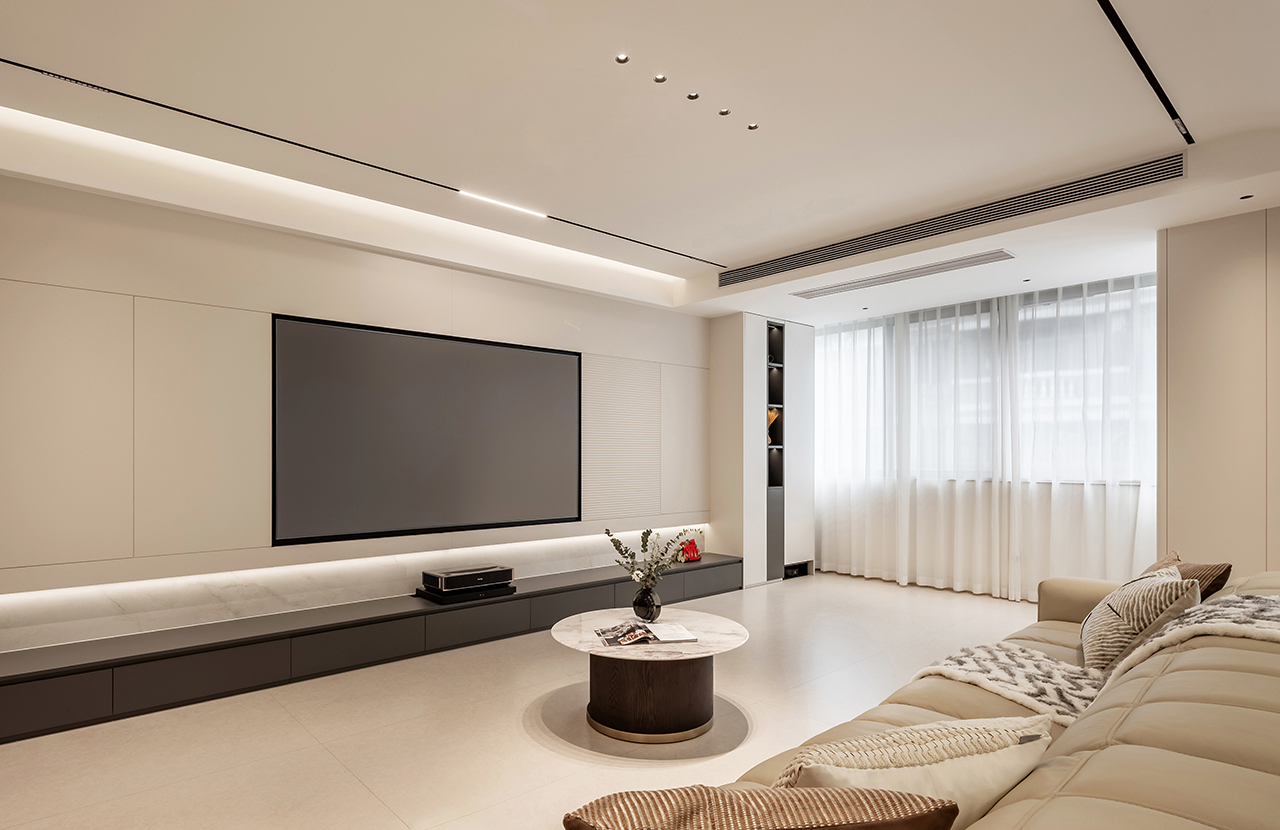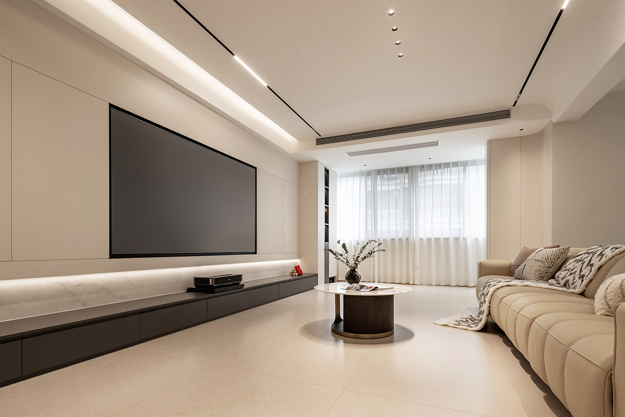以浅暖象牙白为基底色调,搭配天然石材、金属与定制木饰面构建空间肌理。地面采用大板瓷砖通铺,墙面点缀淡灰色微水泥肌理,通过材质碰撞诠释现代轻奢美学。悬浮式石膏板吊顶搭配磁吸轨道灯系统,实现无主灯设计的层次光影。