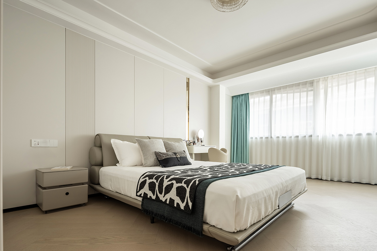 整合原始结构形成16㎡主卧套间,配备步入式衣帽间与独立卫浴。悬浮床头背景墙搭配线性灯光系统,定制软包床体营造舒适休憩场域。玻璃隔断划分冥想区与阅读角,实现空间功能柔性转换。