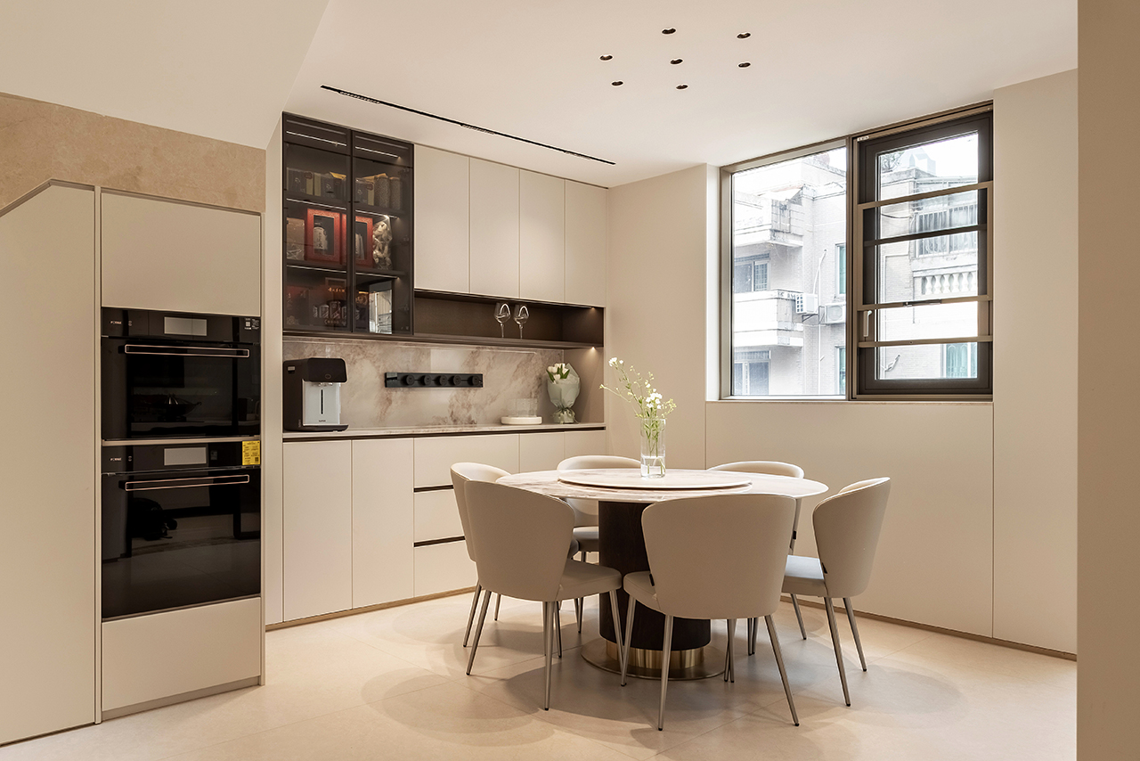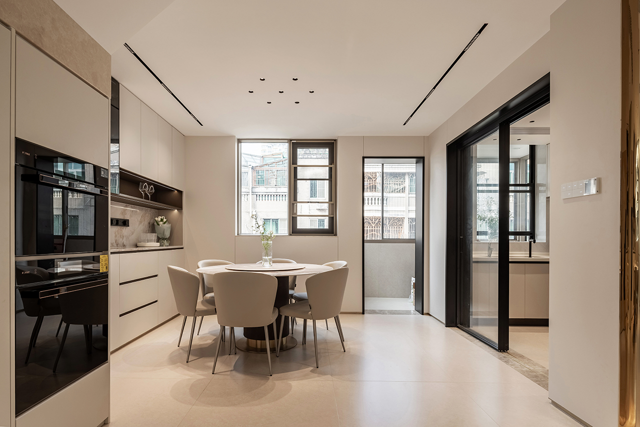 客餐厅区域采用LDK一体化设计,配备270°全景落地窗引入室内外景观互动,定制电动遮阳帘系统实现光环境智能调节。艺术装置墙与隐形收纳系统形成视觉平衡。