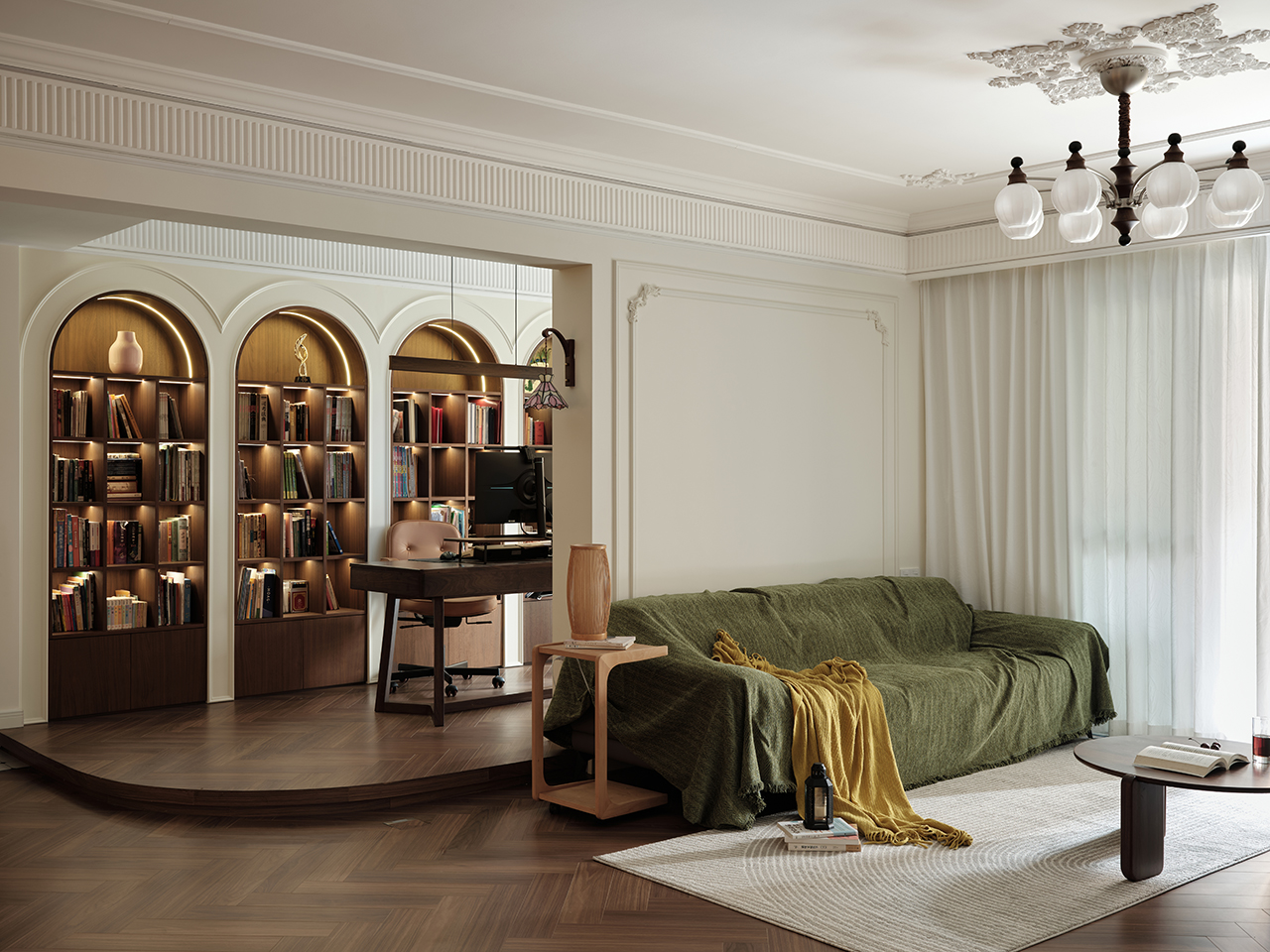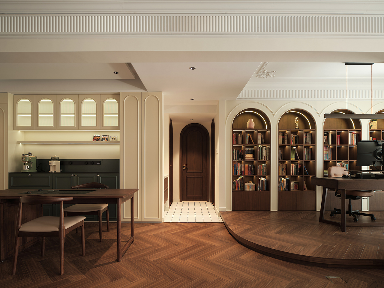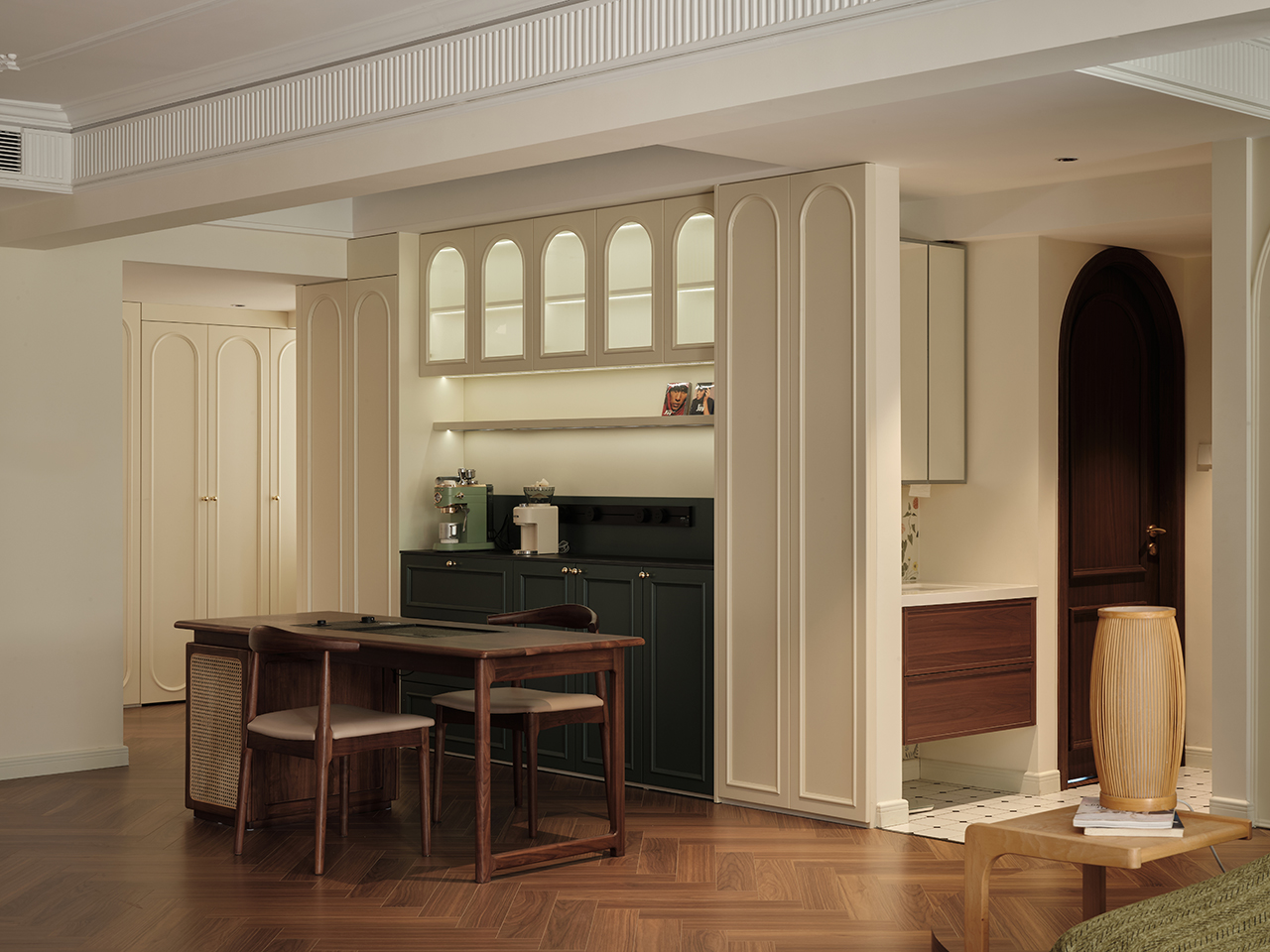 全屋铺设的人字拼木地板,以灵动的线条引导视线延伸,每一步都踩在温润的质感上。